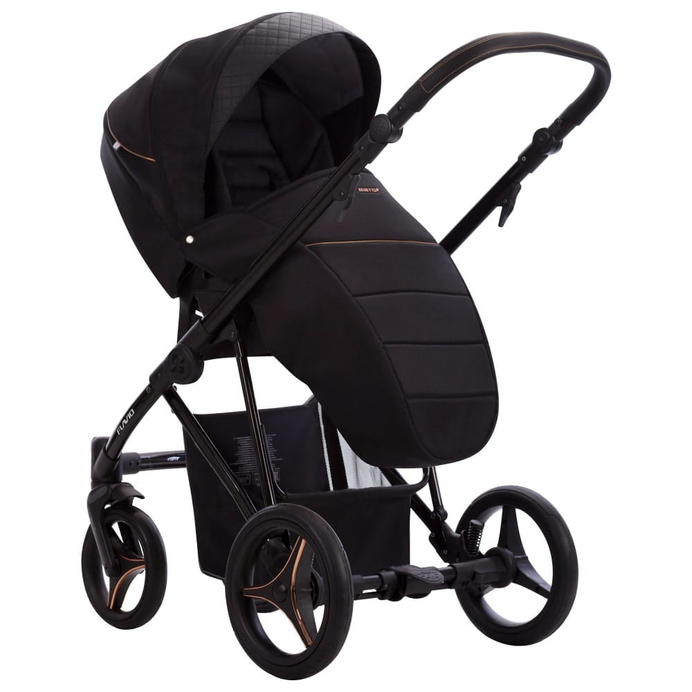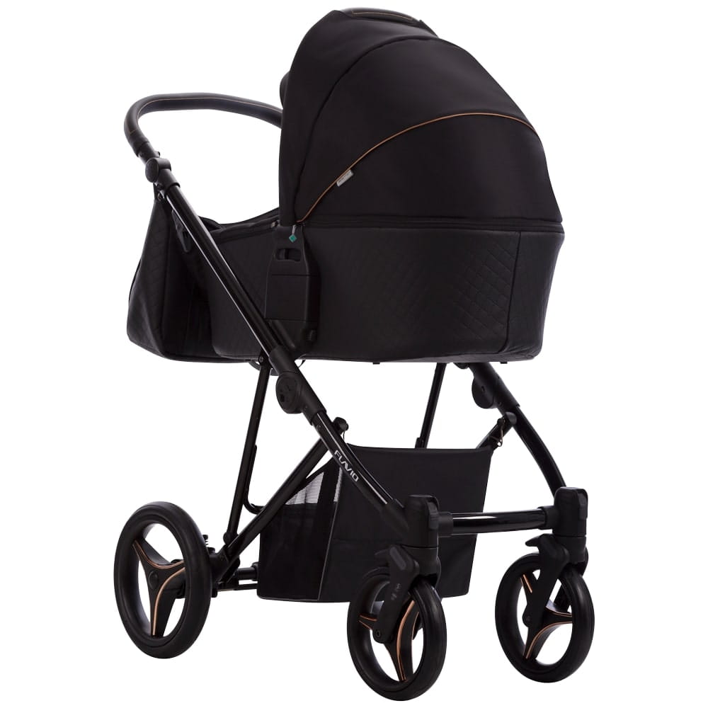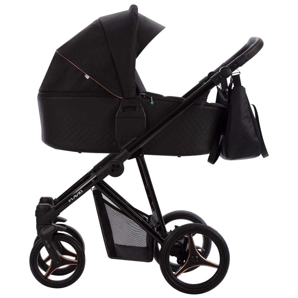 W wózku Flavio Gloss tapicerowana budka połączona jest z pikowanym dnem z eko-skóry. Delikatne detale w kolorze miedzi doskonale współgrają z czarną połyskującą konstrukcją.