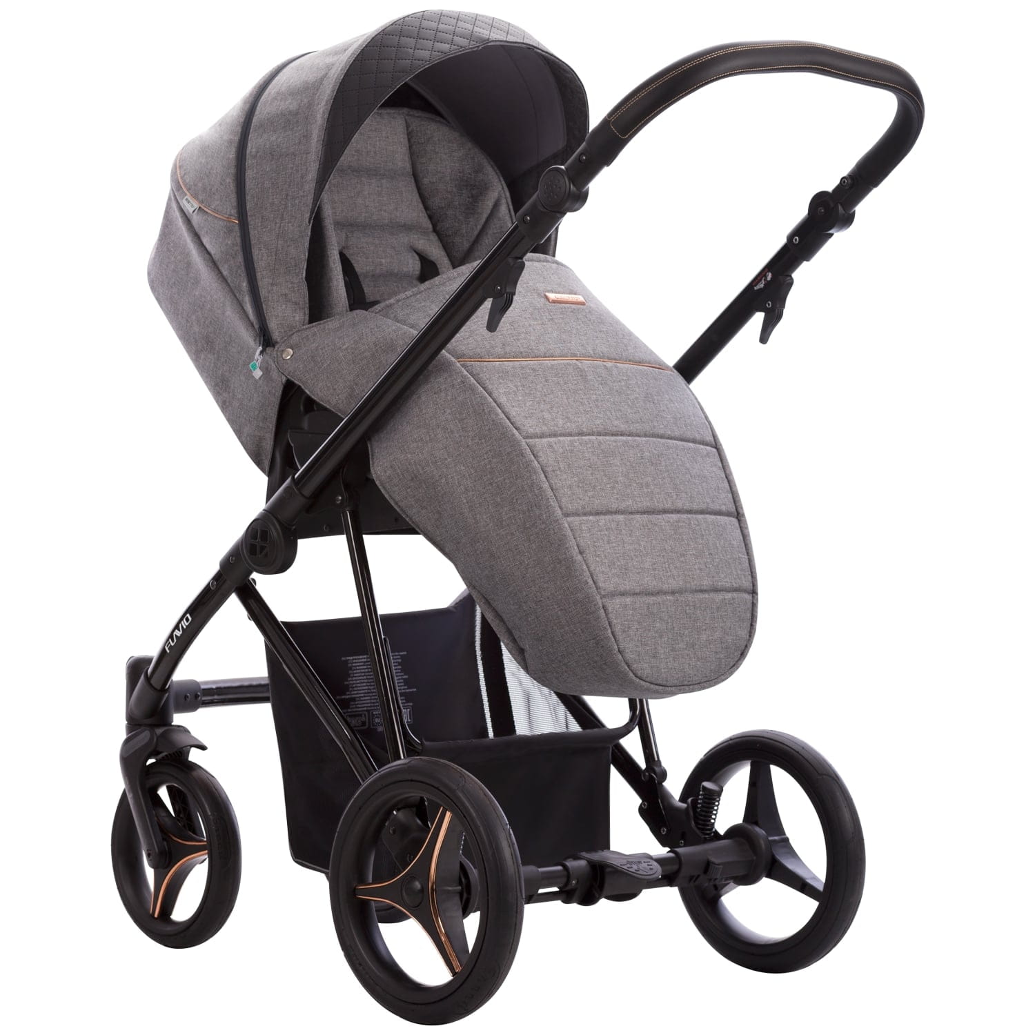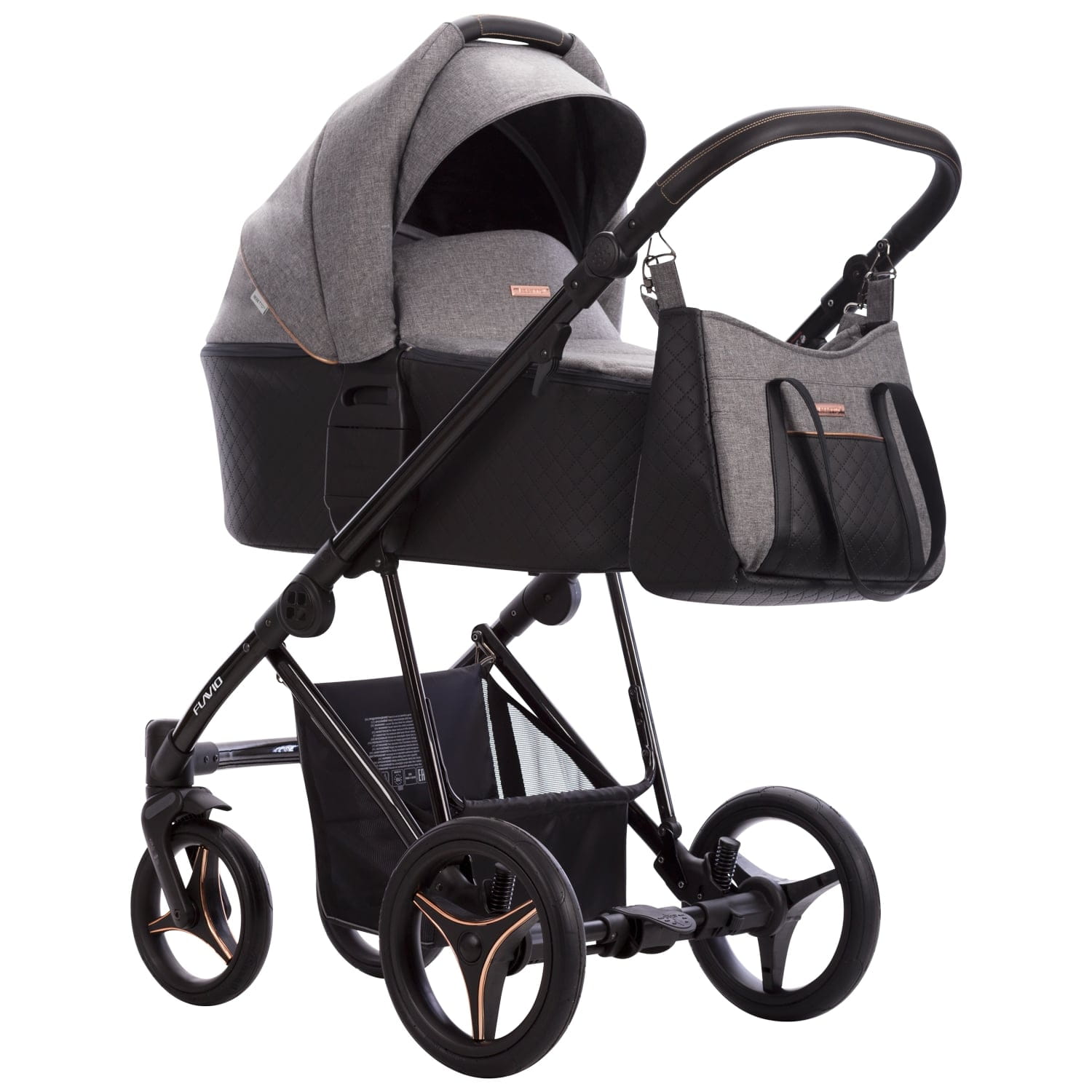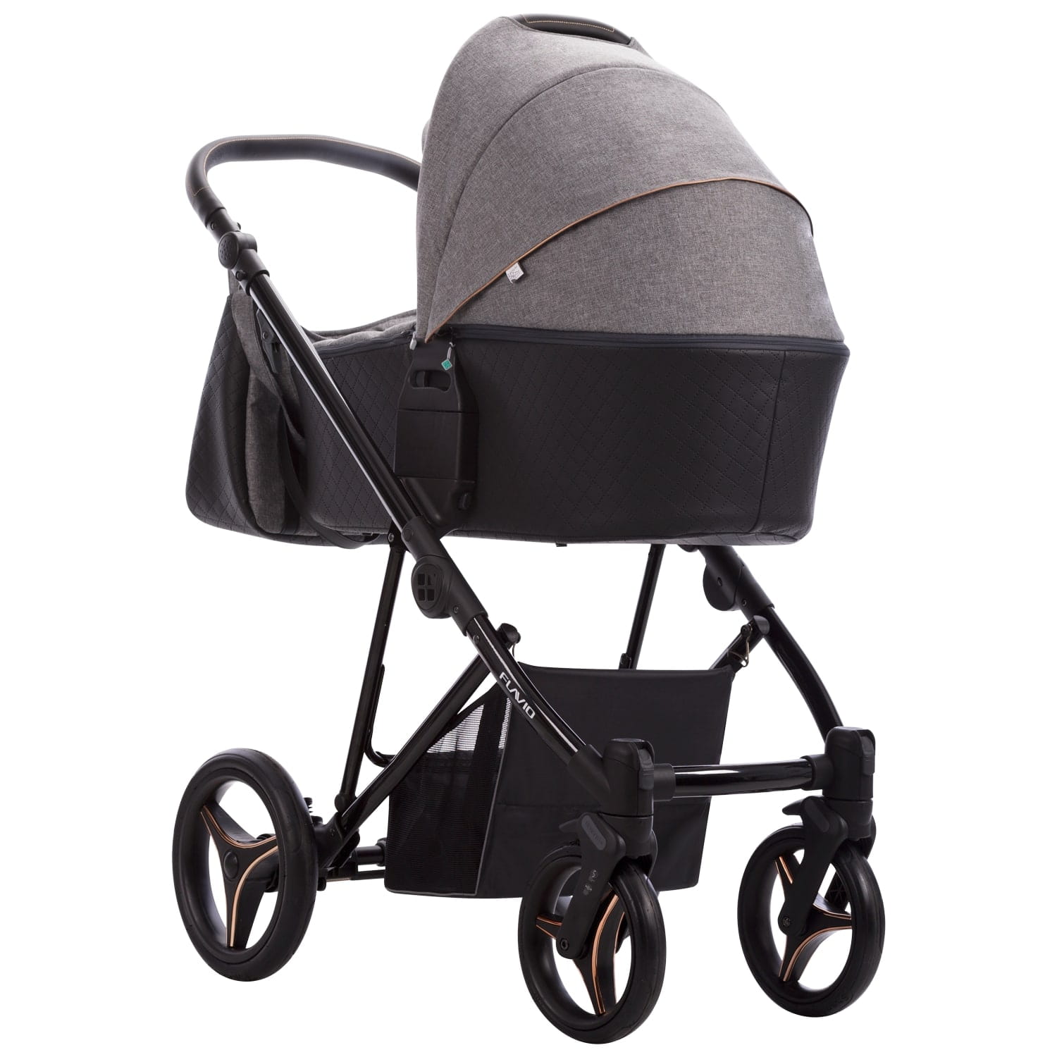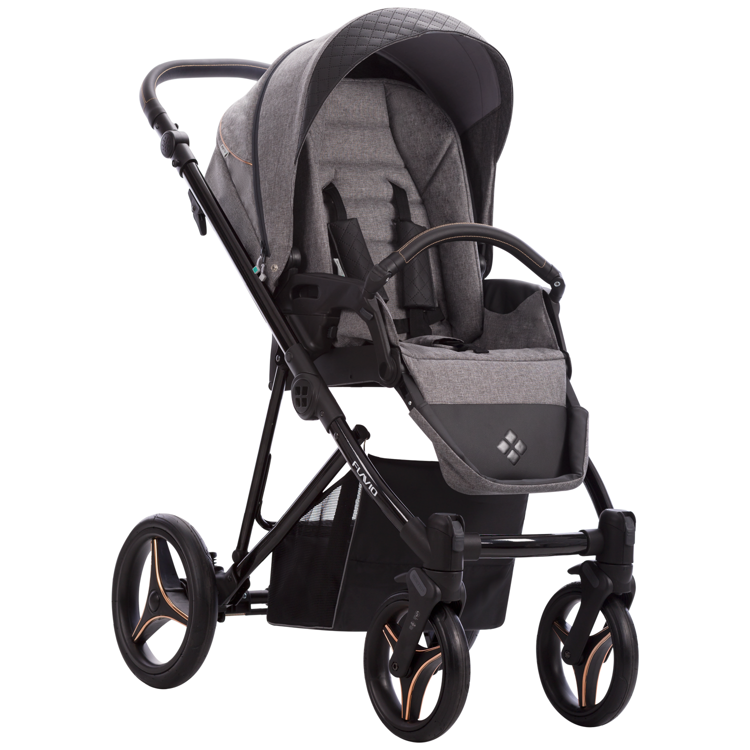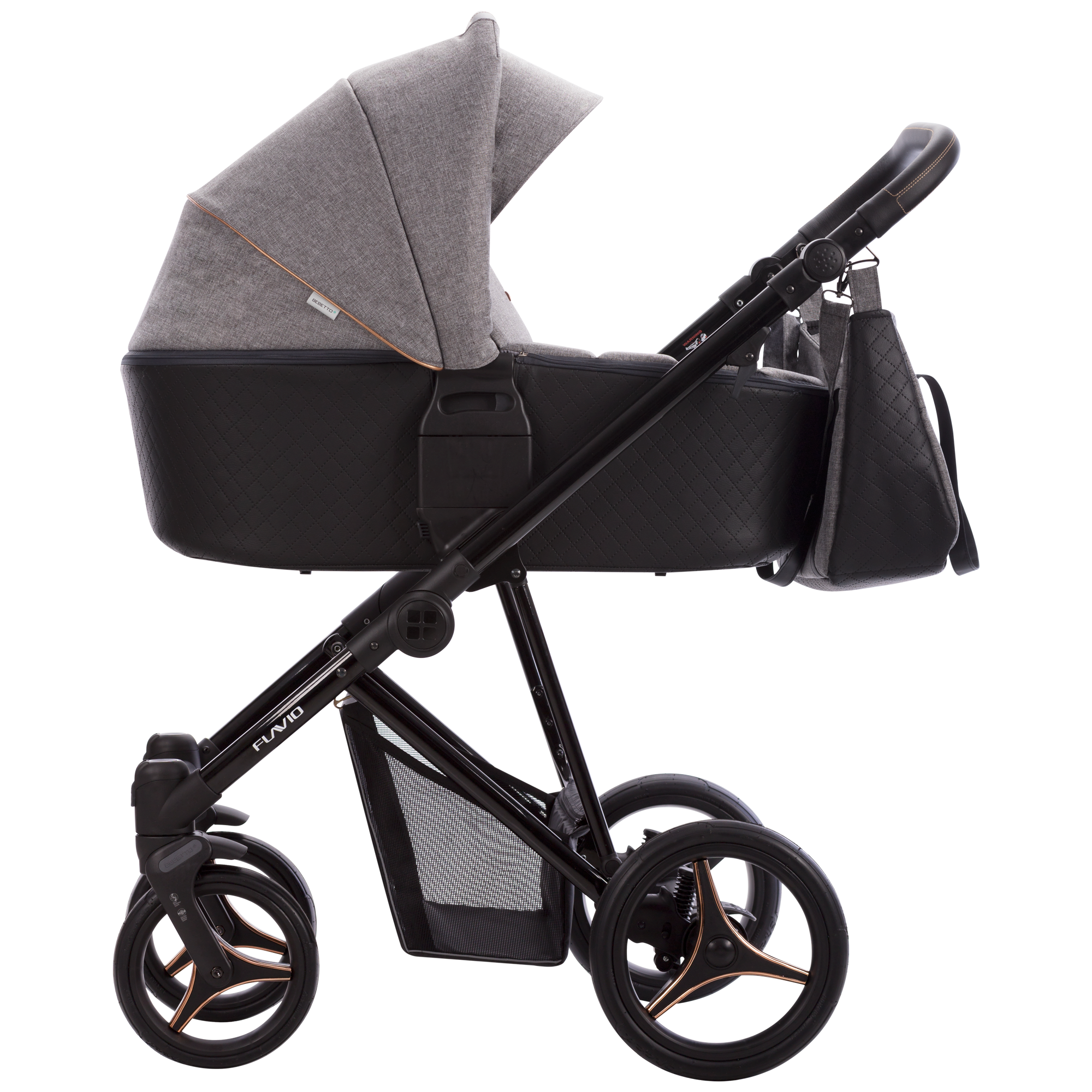 W wózku Flavio Gloss tapicerowana budka połączona jest z pikowanym dnem z eko-skóry. Delikatne detale w kolorze miedzi doskonale współgrają z czarną połyskującą konstrukcją.