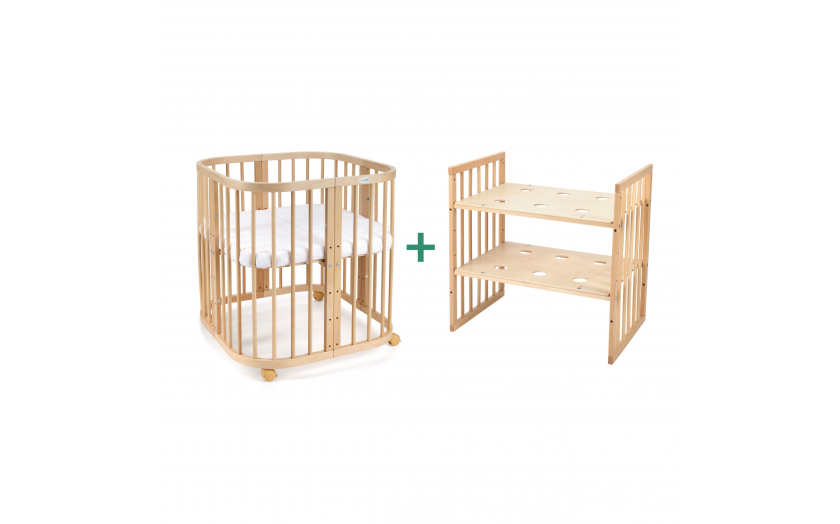 Mebelek może być wykorzystywany także jako małe łóżeczko. Najważniejsze zalety tej konfiguracji to kompaktowe wymiary i mobilność. Przymocowane do podstawy łóżeczka gumowane kółka pozwalają na jego przesuwanie, zostały wyposażone w blokadę. Z reszty drewnianych elementów stworzycie funkcjonalny przewijak z dodatkową półką, który ułatwi codzienną pielęgnację malucha i przewijanie.