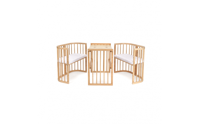 Nie musicie rezygnować z naszego mebelka, kiedy dziecko będzie starsze. Może pełnić funkcję zestawu – stolik i 2 krzesełka. Wystarczy, że wrócicie do konfiguracji dwóch dostawek i przewijaka. Po dostosowaniu wysokości blatu i siedziska maluch zyska elegancki i komfortowy kącik do zabawy, idealny dla przedszkolaka.