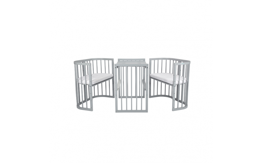 Nie musicie rezygnować z naszego mebelka, kiedy dziecko będzie starsze. Może pełnić funkcję zestawu – stolik i 2 krzesełka. Wystarczy, że wrócicie do konfiguracji dwóch dostawek i przewijaka. Po dostosowaniu wysokości blatu i siedziska maluch zyska elegancki i komfortowy kącik do zabawy, idealny dla przedszkolaka.